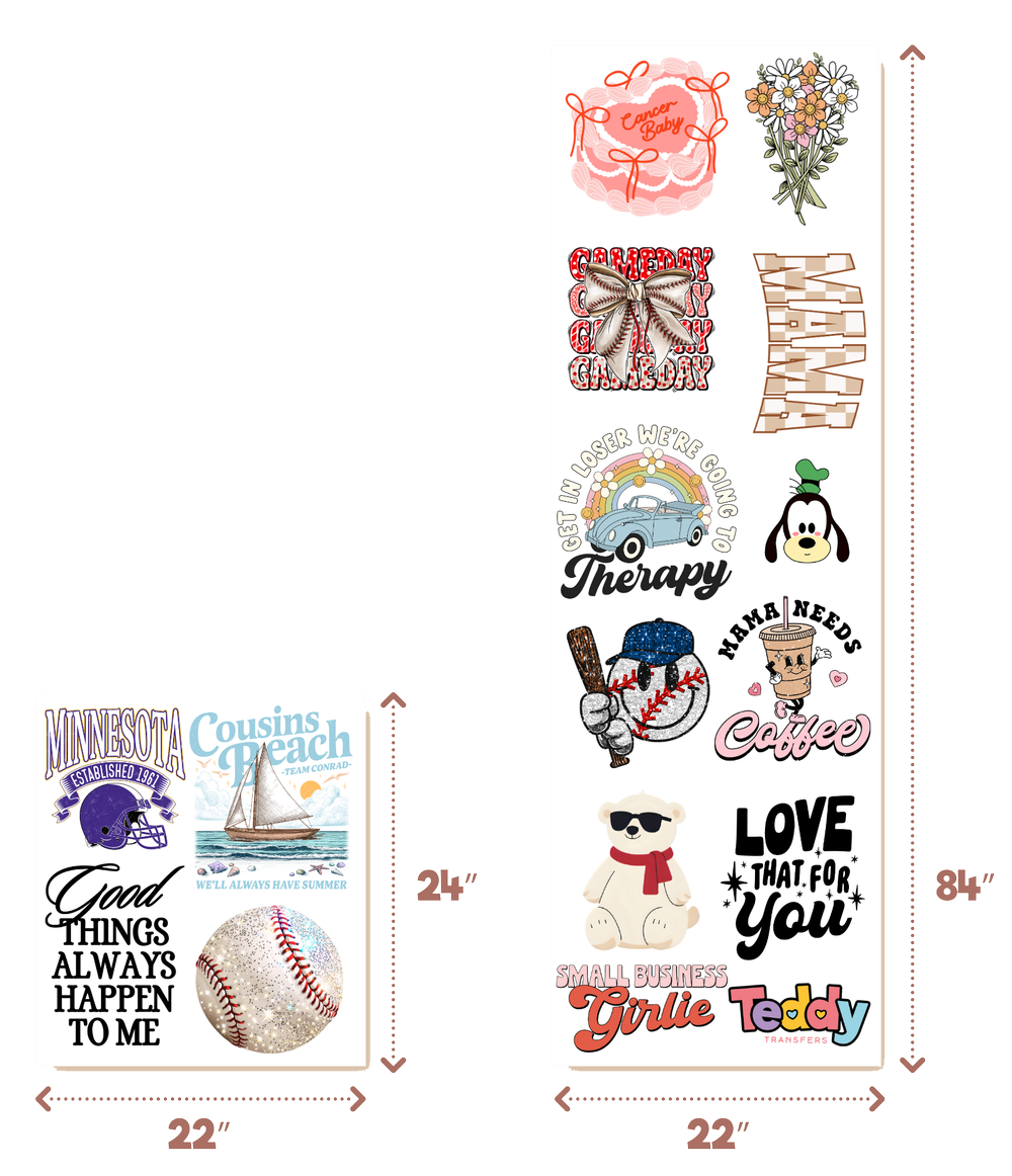 DTF + UV DTF in one place: Apparel, hats, totes, cup wraps, decals, and more.